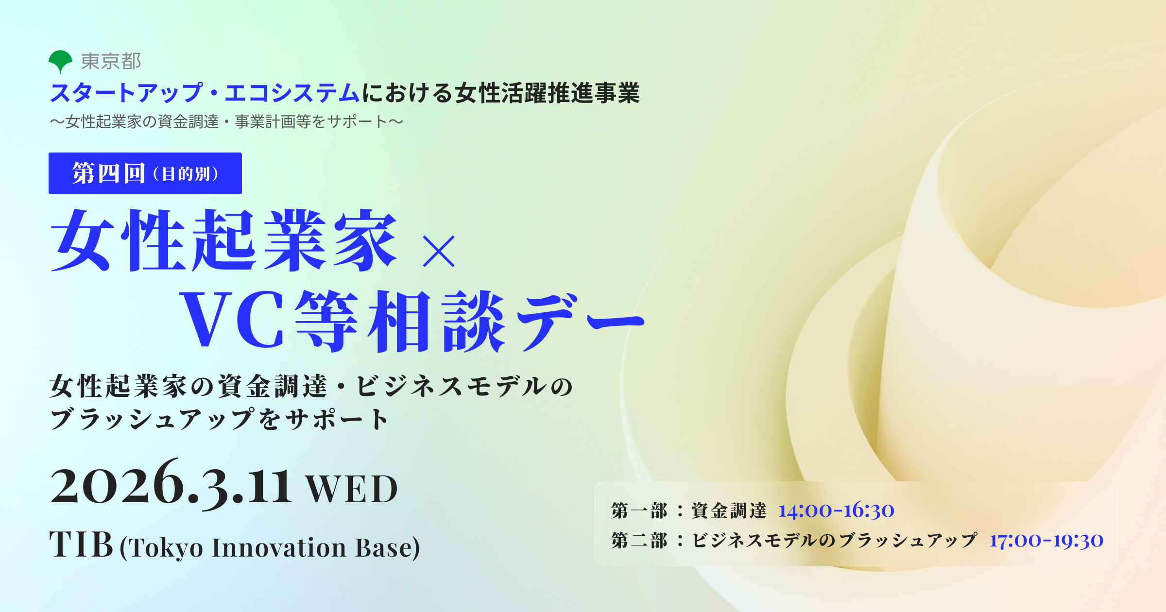 【2026年3月11日(水)14:00〜】第4回(目的別)女性起業家×VC等相談デー -